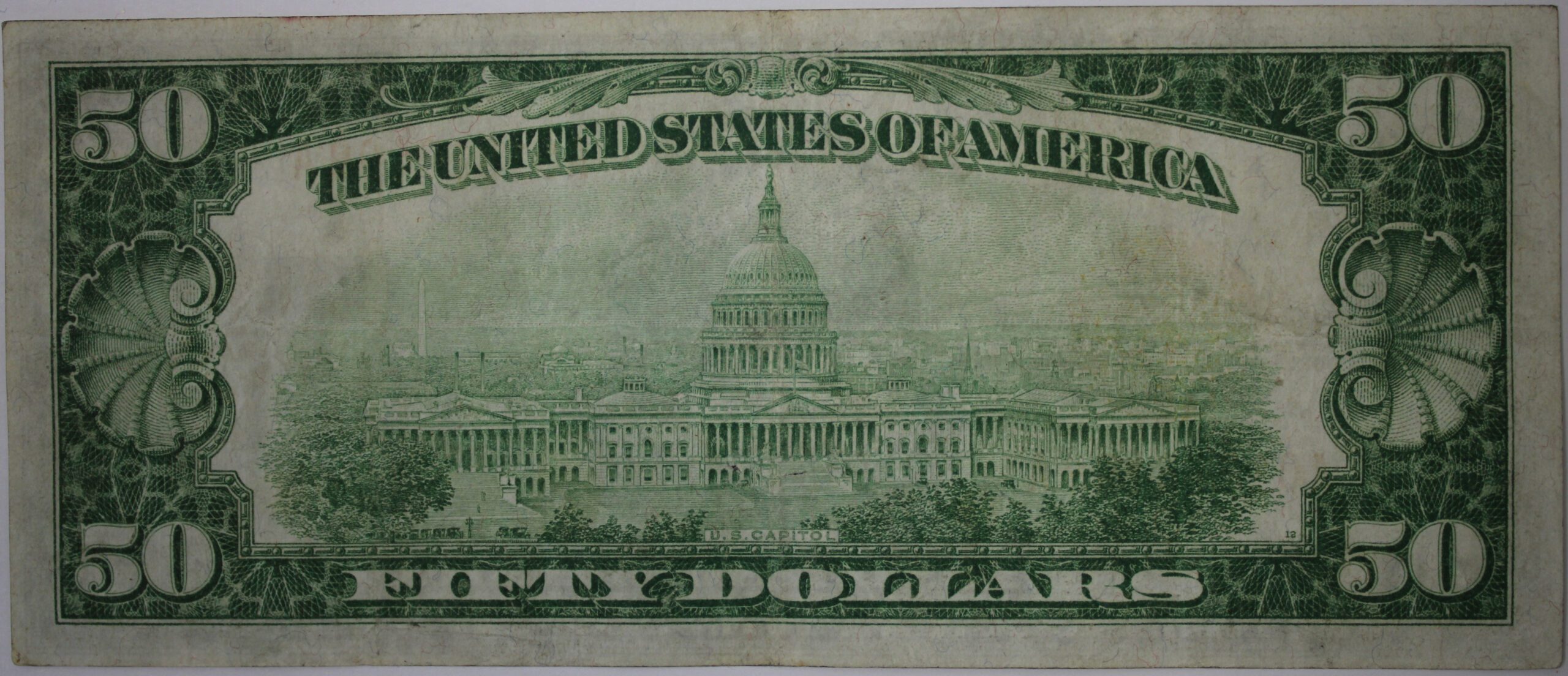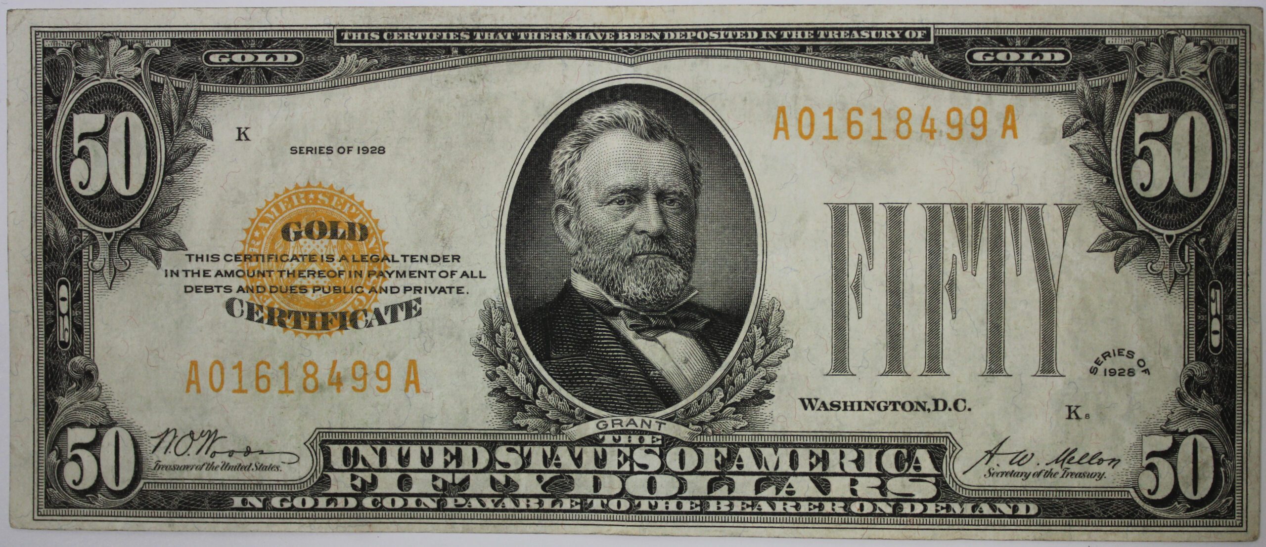 1928 $50 Gold Certificate Has 3 Pin Holes But Is AU