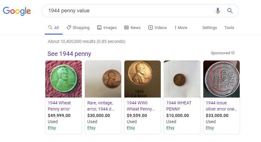 Here’s an example: If you type in 1944 penny value in a google search this is the first thing you see.