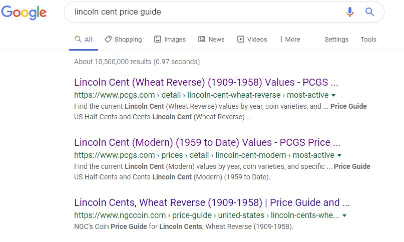 What you should be searching for is a legitimate price guide, so your search should be, Lincoln Cent Price Guide. When you do that you see a result as in the image below.