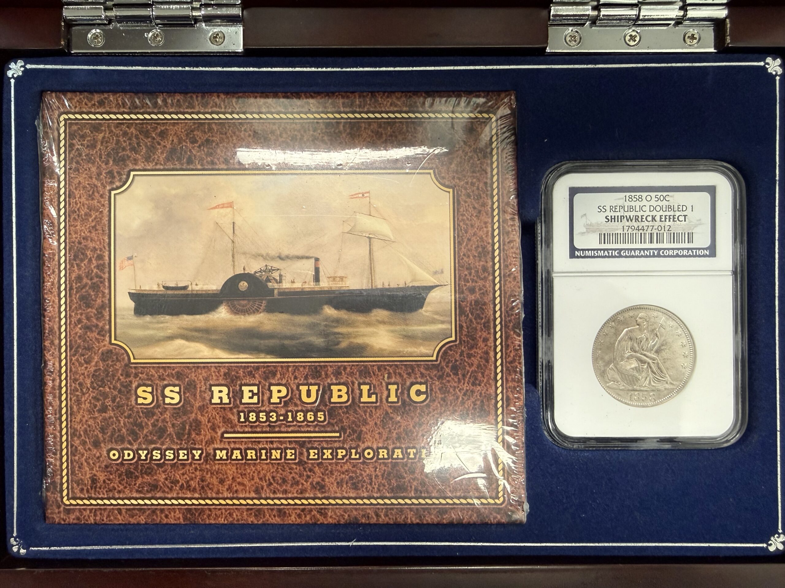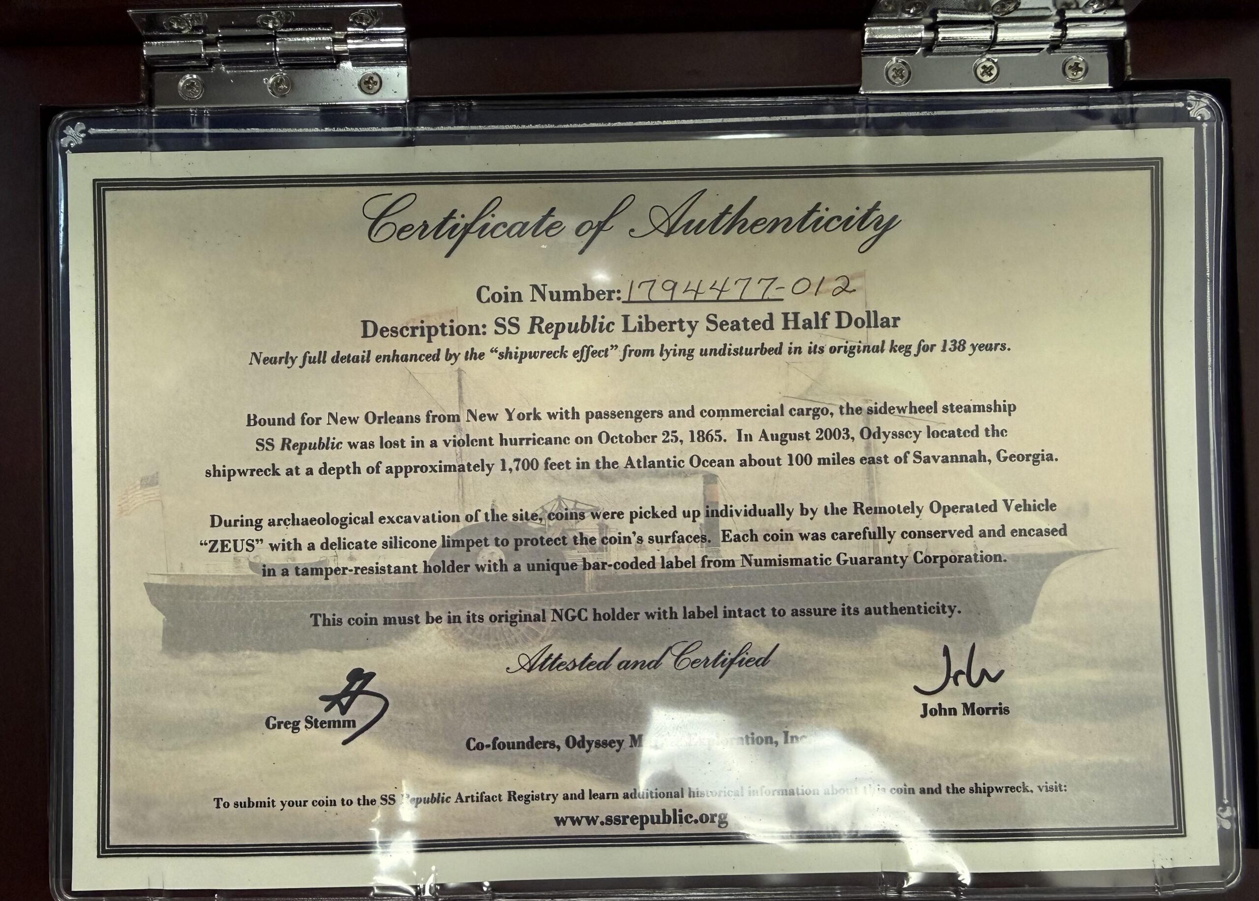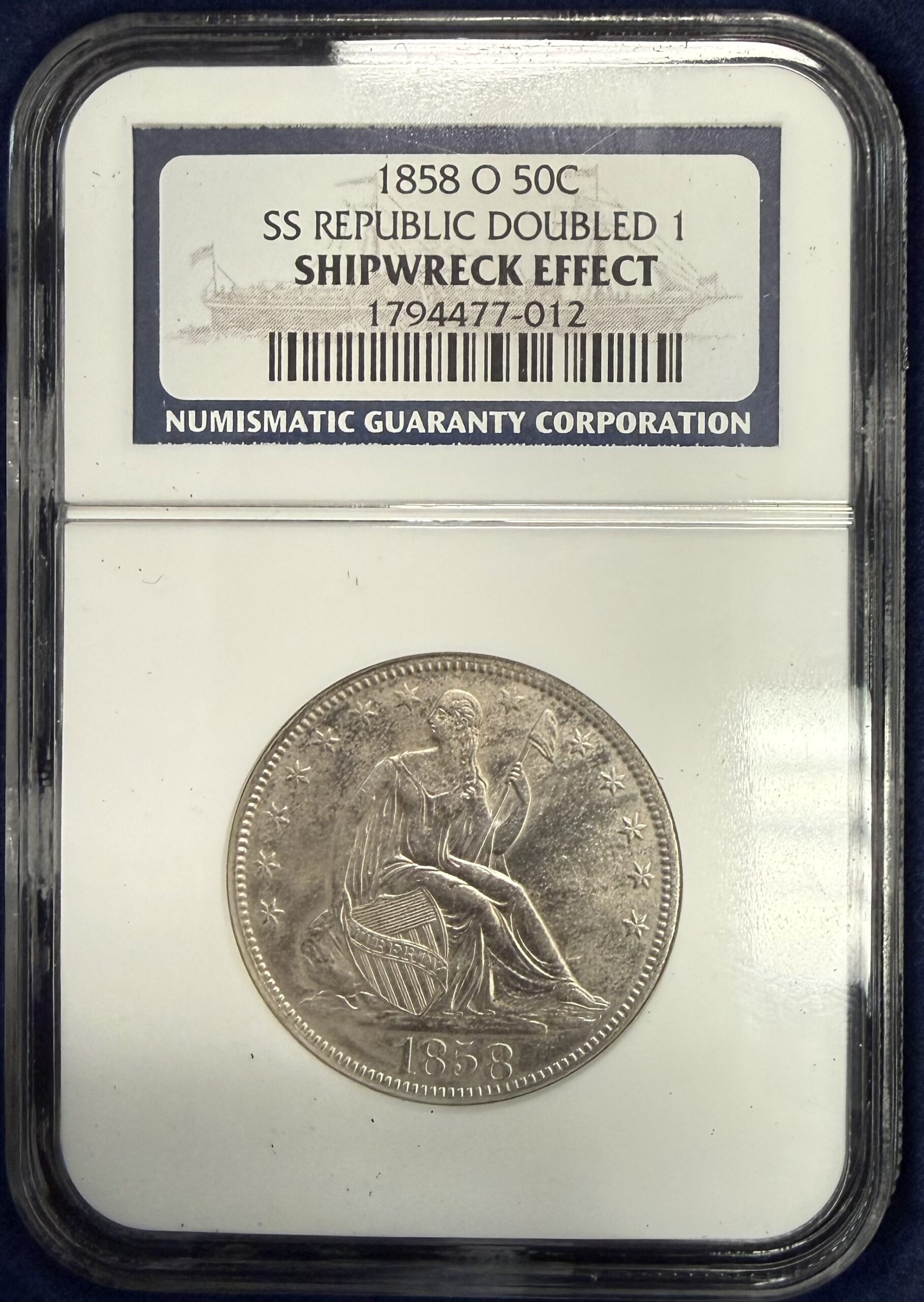 1858 O Seated Half Dollar SS Republic Shipwreck Effect NGC Box & Paperwork