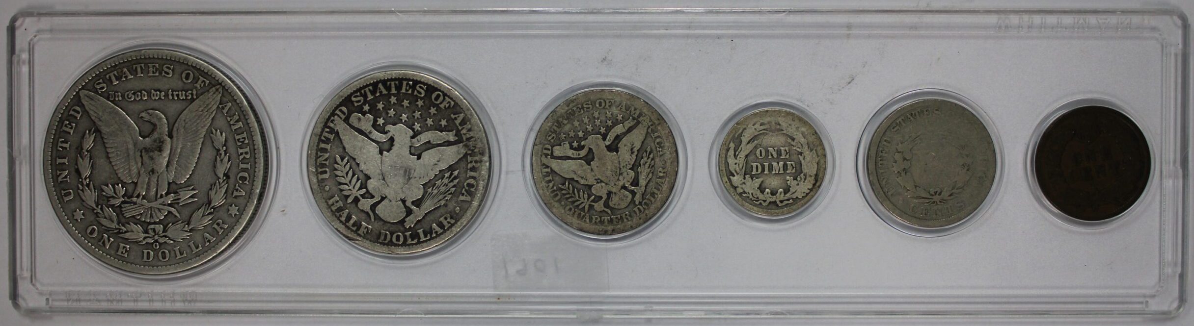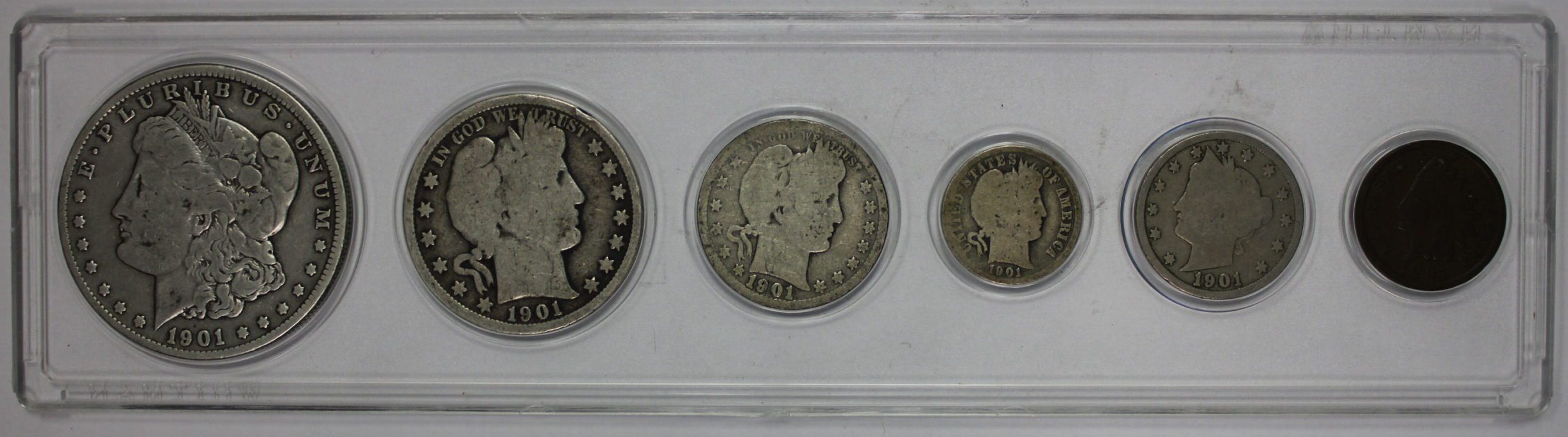 1901 Year Set Circulated.  The coins are 1901-O Morgan Dollar, 1901 Half, 1901 Quarter, 1901 Dime, 1901 Nickel and a 1901 Indian Head Cent.