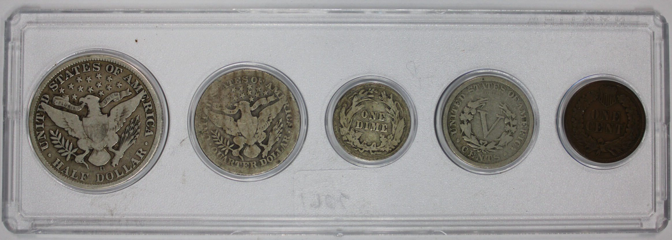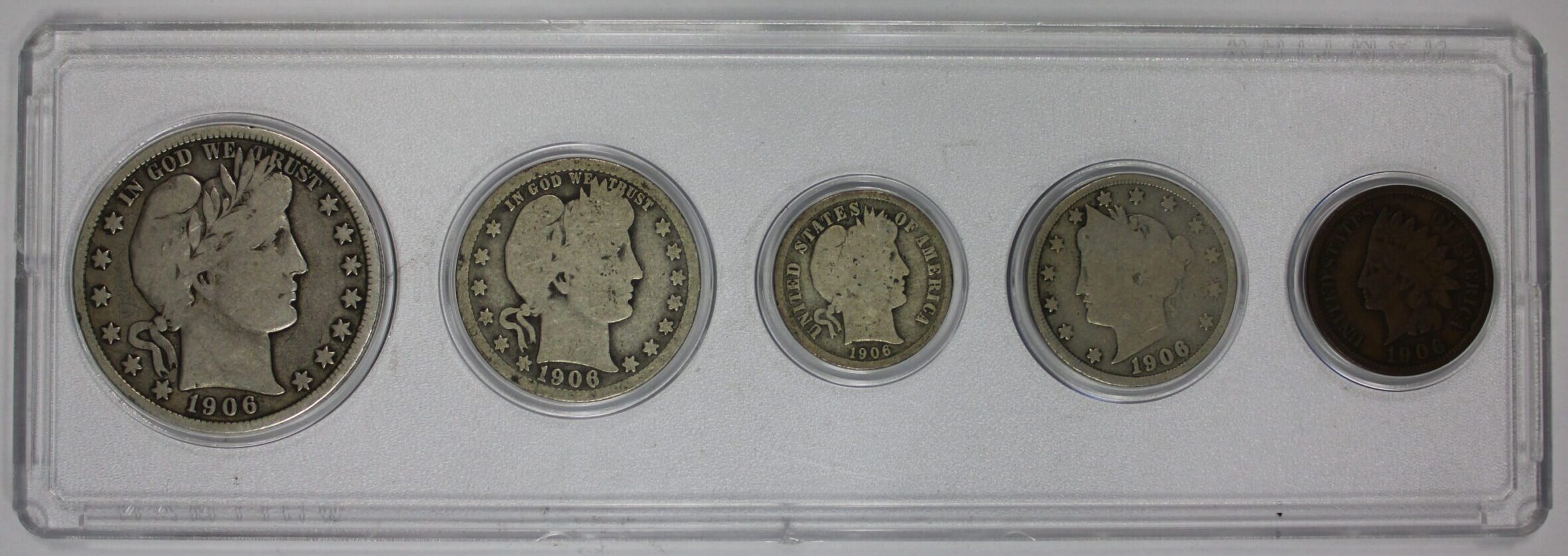 1906 Year Set Circulated. The coins are 1906-D Half, 1906 Quarter, 1906 Dime, 1906 Nickel and 1906 Indian Head Cent