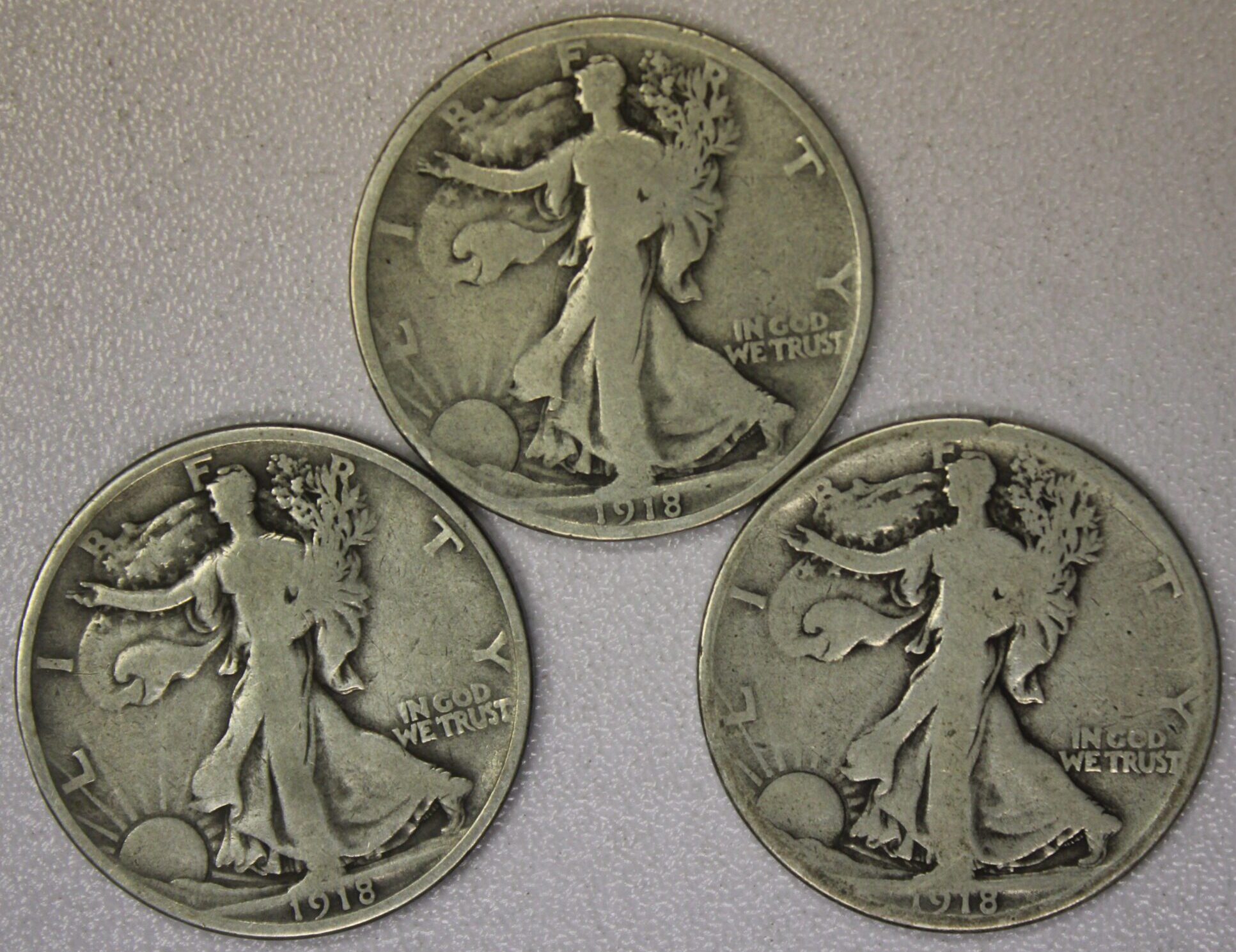 1918, 1918-D & 1918-S Walking Liberty Half Dollars Good to Very Good