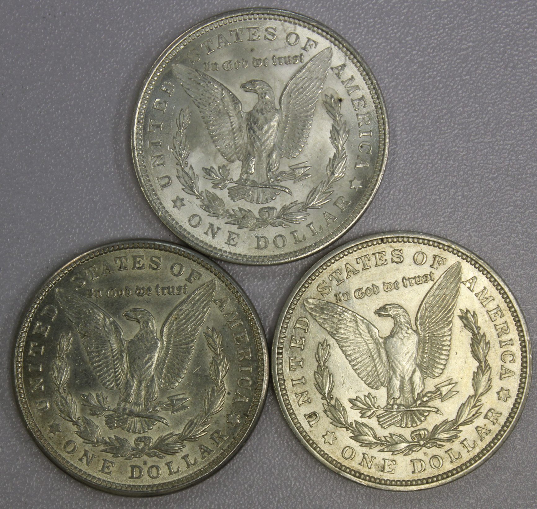 1921 P D S Three Coin Morgan Dollar Set. This is a stock photo. The coins you will receive will be as nice or better.