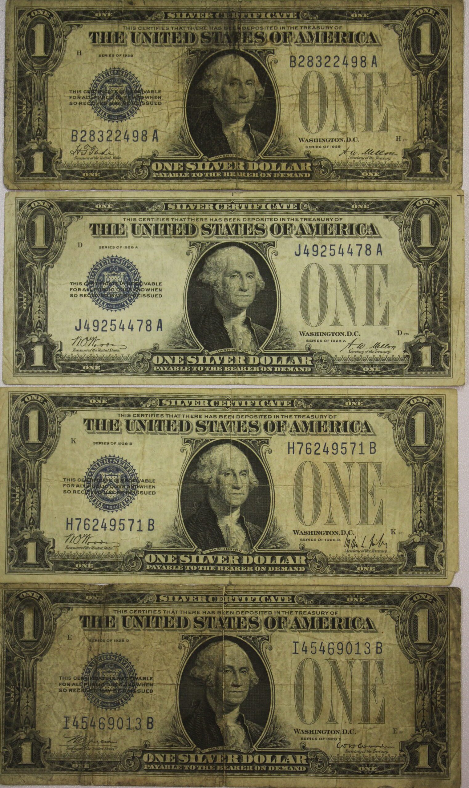 1928, 1928-A, 1928-B & 1928-D One Dollar Silver Certificates Funny Backs Circulated