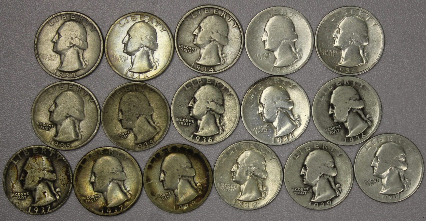 1932-1939 Washington Quarters 16 Different dates & Mints Including 1932-D. The dates are 1932, 1932-D, 1934, 1934-D, 1935, 1935-D, 1935-S, 1936, 1936-D, 1936-S, 1937, 1937-D, 1938, 1938-S, 1939 & 1939-D. These are all well worn
