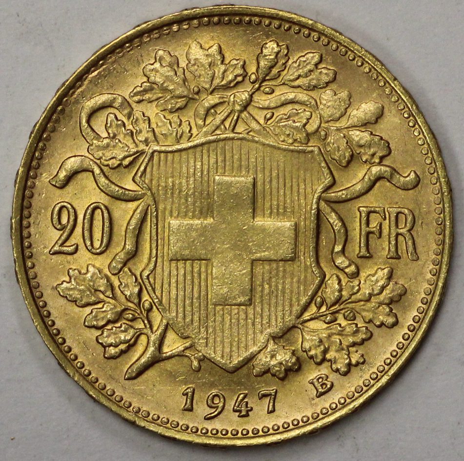 1947 Switzerland 20 Francs Gold Coin. 90% gold. 0.1867 AGW