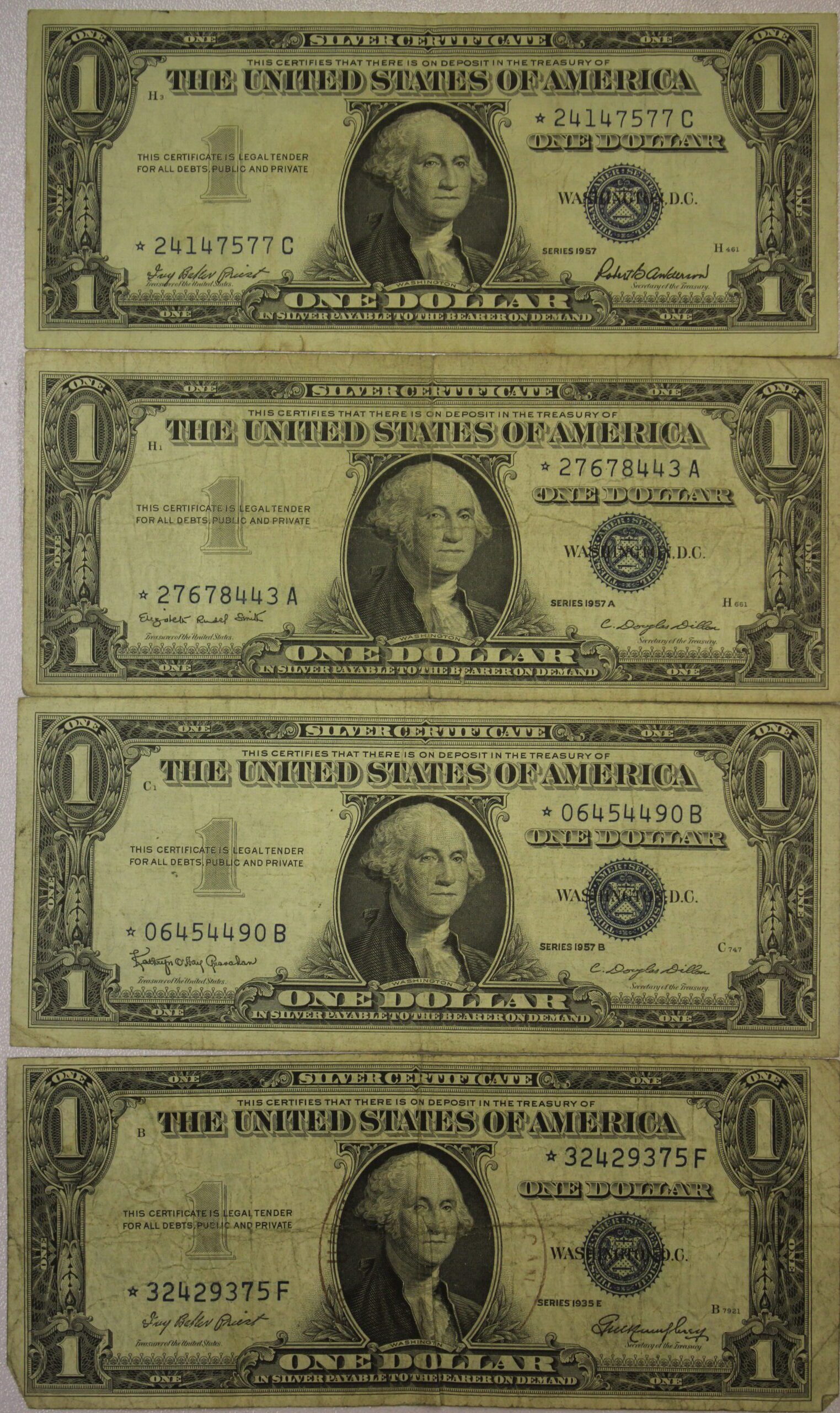 1957, 1957-A, 1957-B & 1935-E One Dollar Silver Certificates Star Notes Circulated