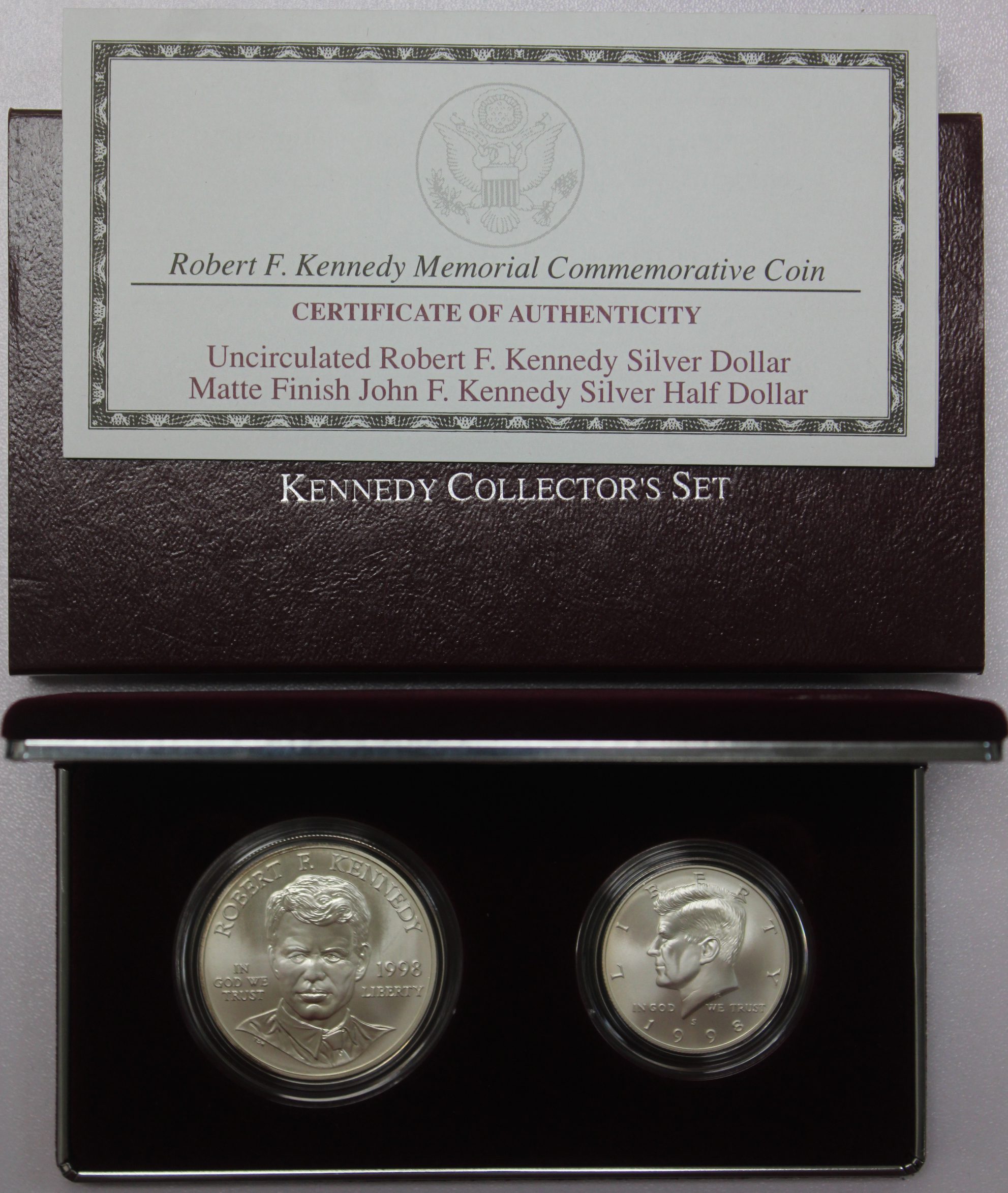 Includes UNC Robert F Kennedy 90% Silver Dollar and Matte Finish John F Kennedy Silver Half Dollar