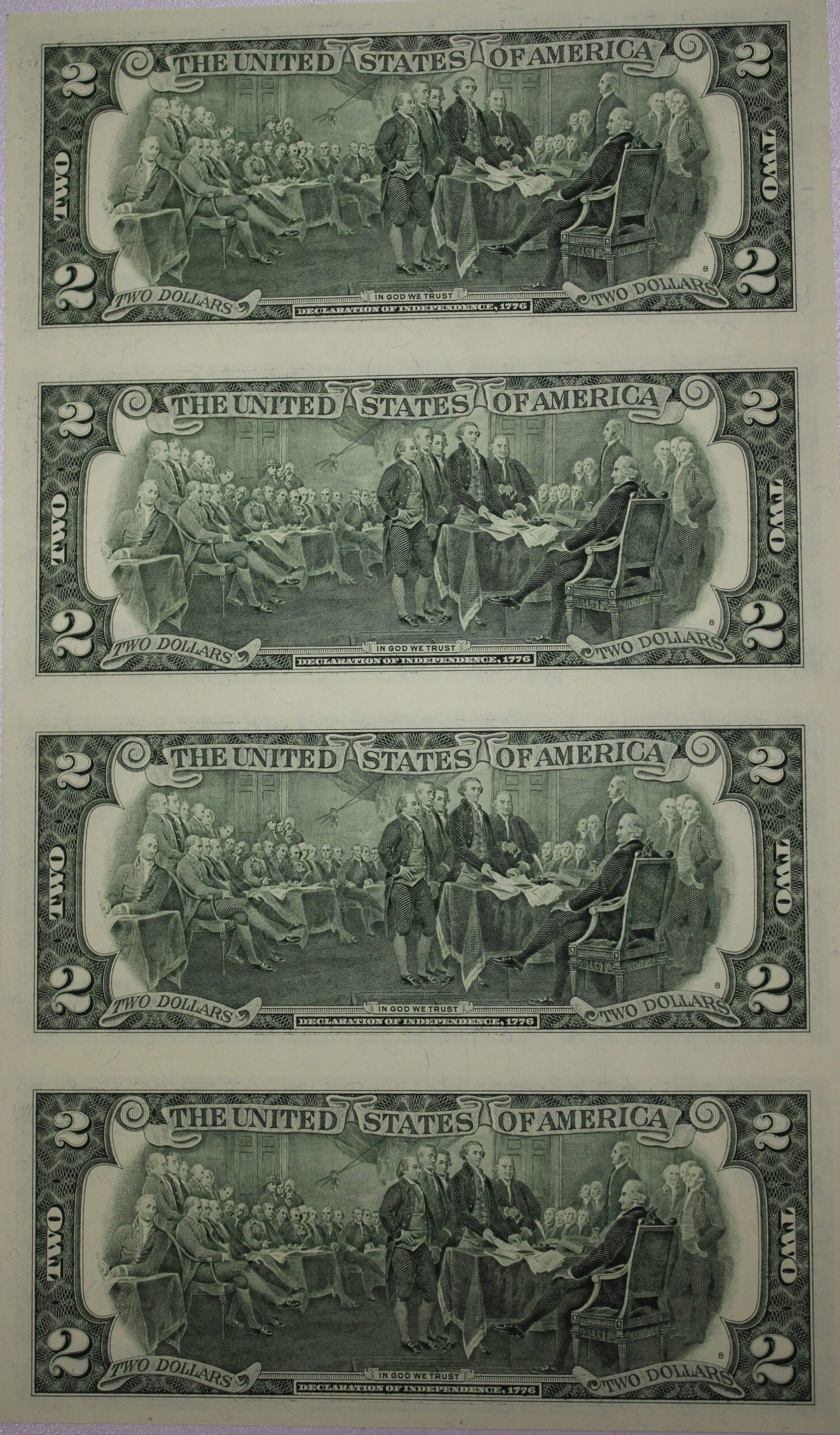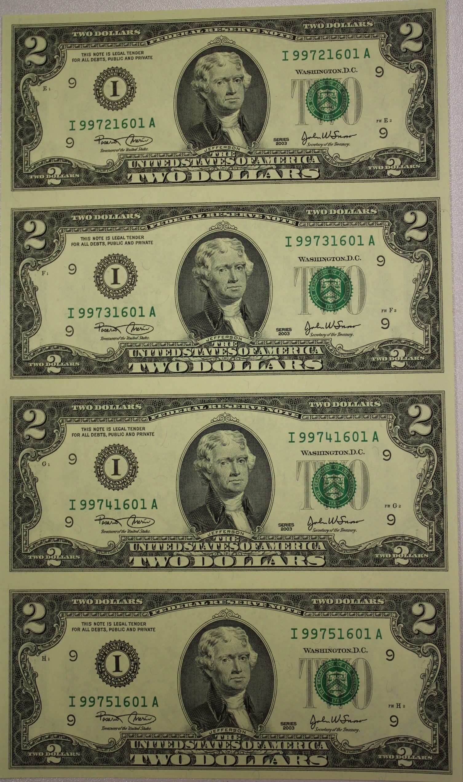 2003 Two Dollar Federal Reserve Notes Minneapolis District Uncut Sheet of Four