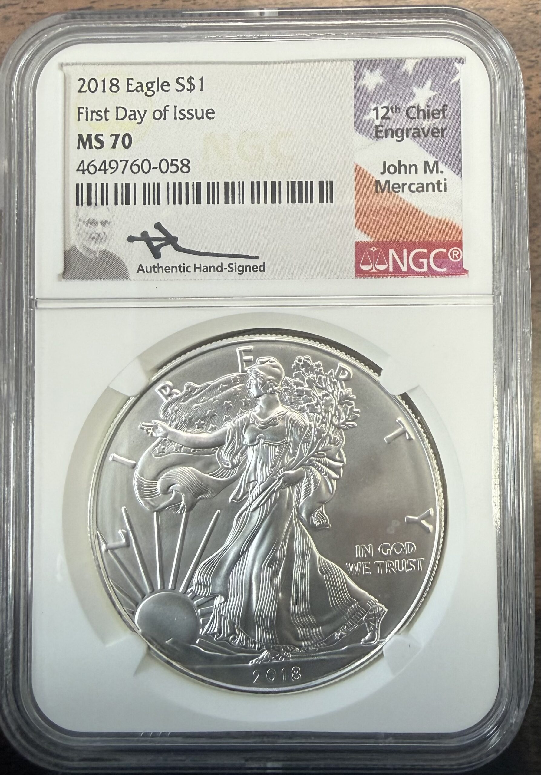 2018 Silver Eagle NGC MS70 First Day Of Issue Mercanti Signed