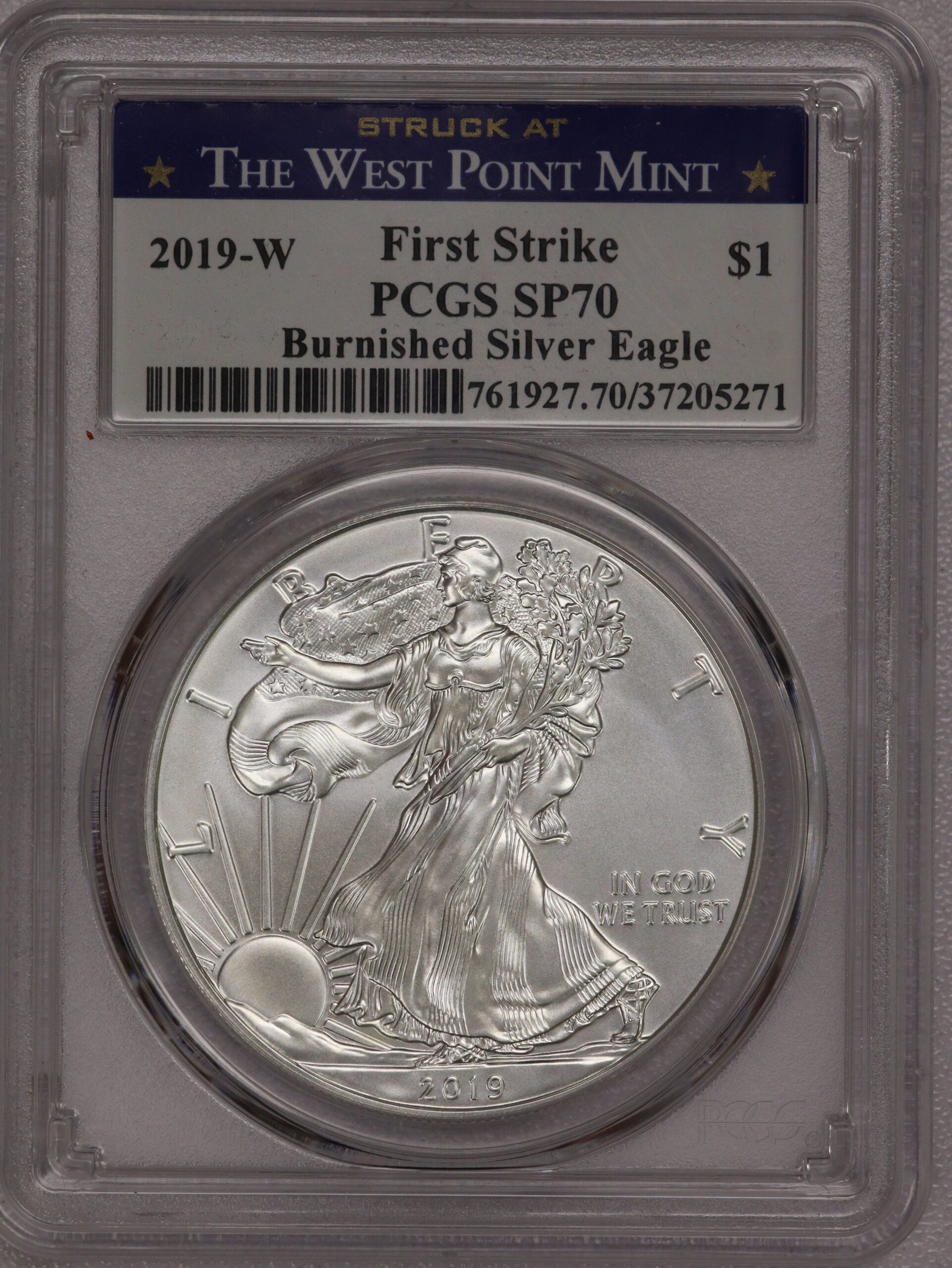 2019 W Silver Eagle FirstStrike Burnished SP70 PCGS Blue West Point Holder