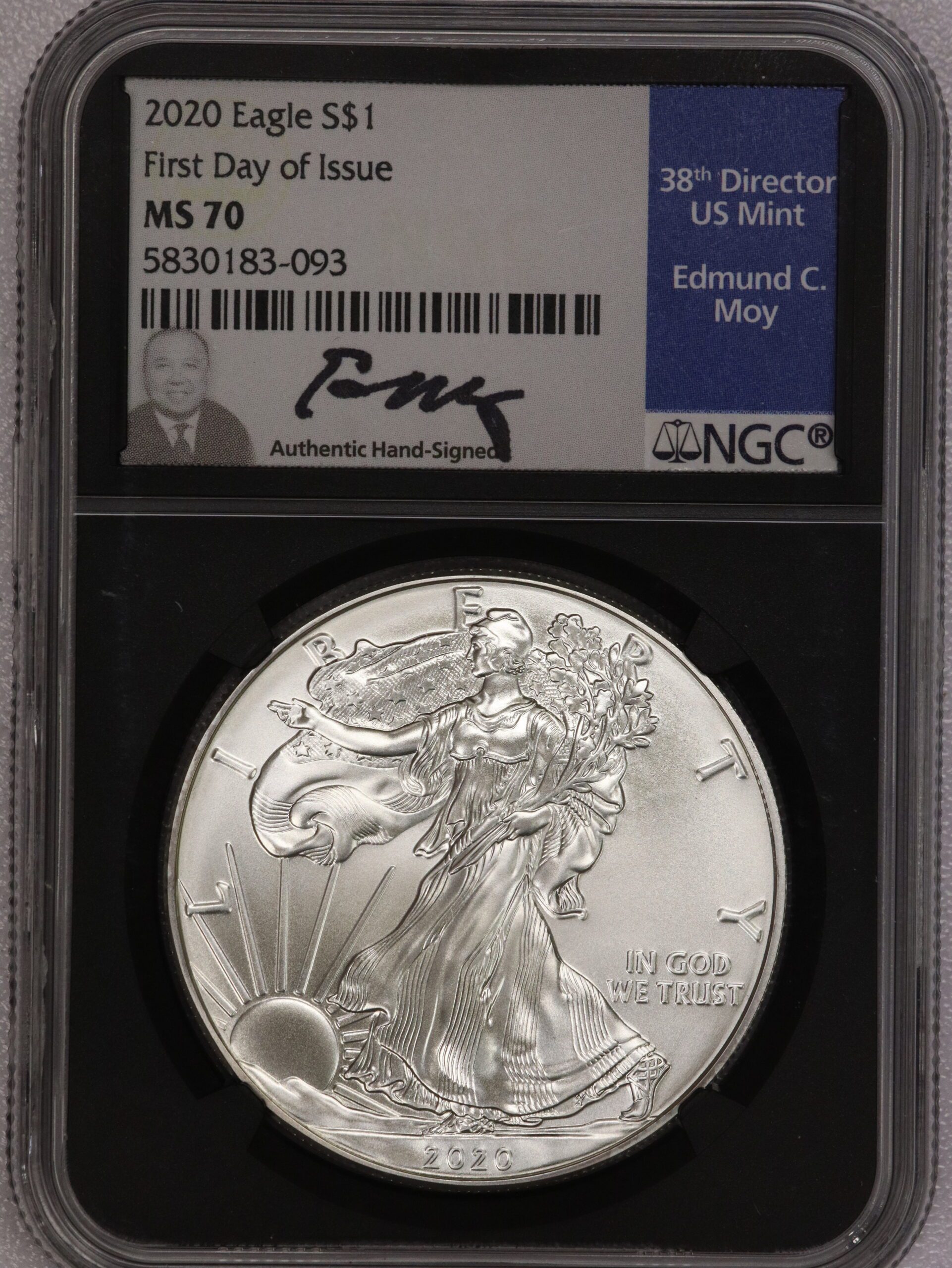 2020 Silver Eagle Black Insert Moy First Day of Issue NGC MS70