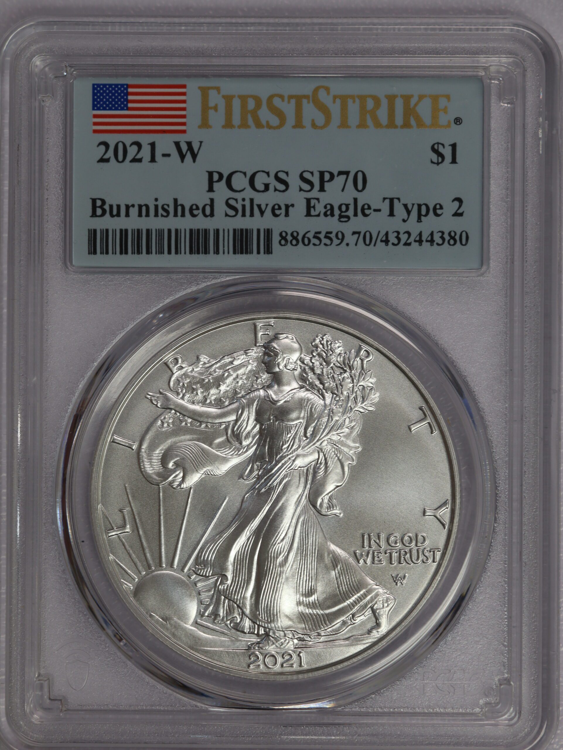 2021 W Burnished Silver Eagle First Strike Type 2 PCGS SP70