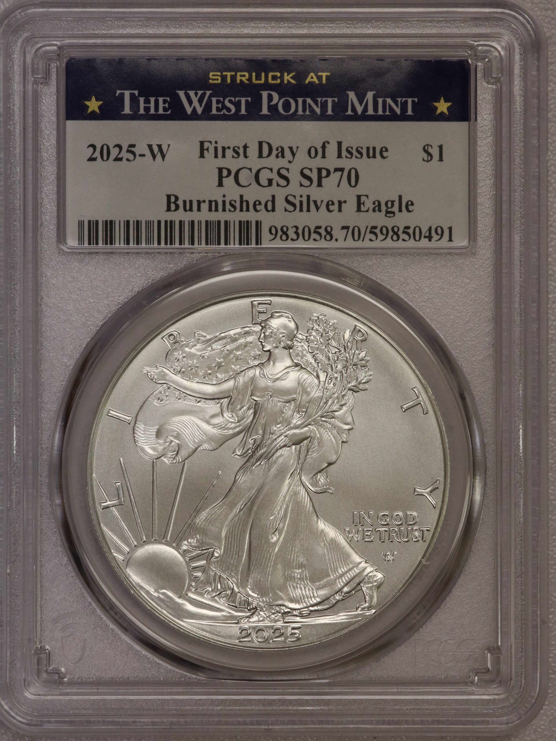 2025 W Silver Eagle First Day Of Issue Burnished SP70 PCGS
