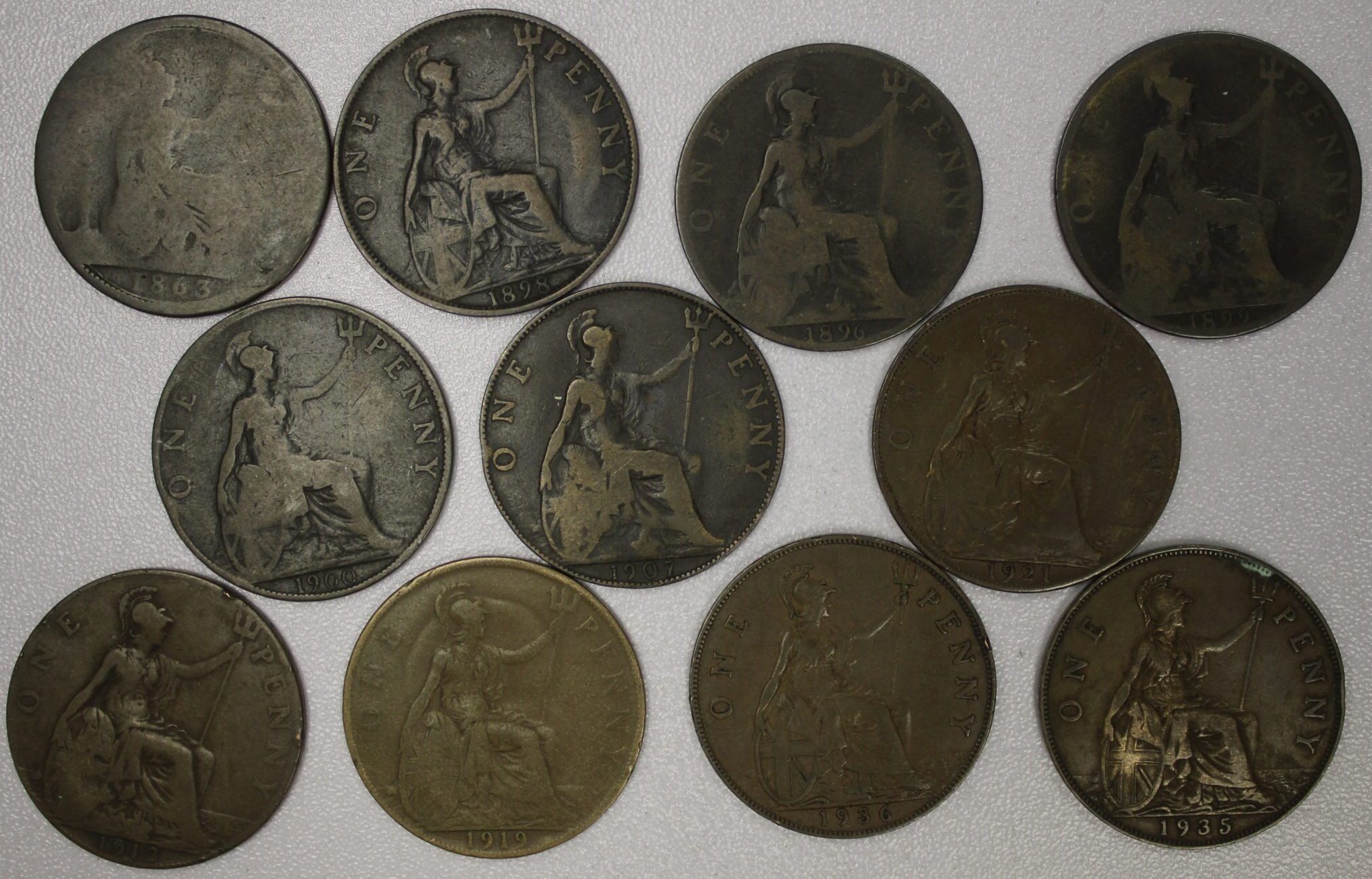 AUCTION-  11 Different Great Britain Pennies Victoria, Edward & George V. The dates are 1863, 1896, 1898, 1899, 1900, 1907, 1912, 1919, 1921, 1935 & 1936
