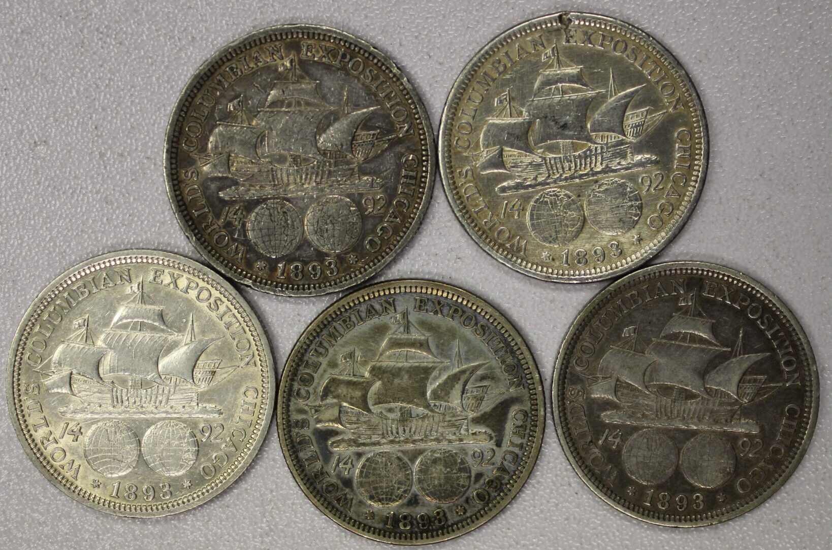 AUCTION-Â Â 1893 Columbian Half Dollars Lot of Five All are Circulated