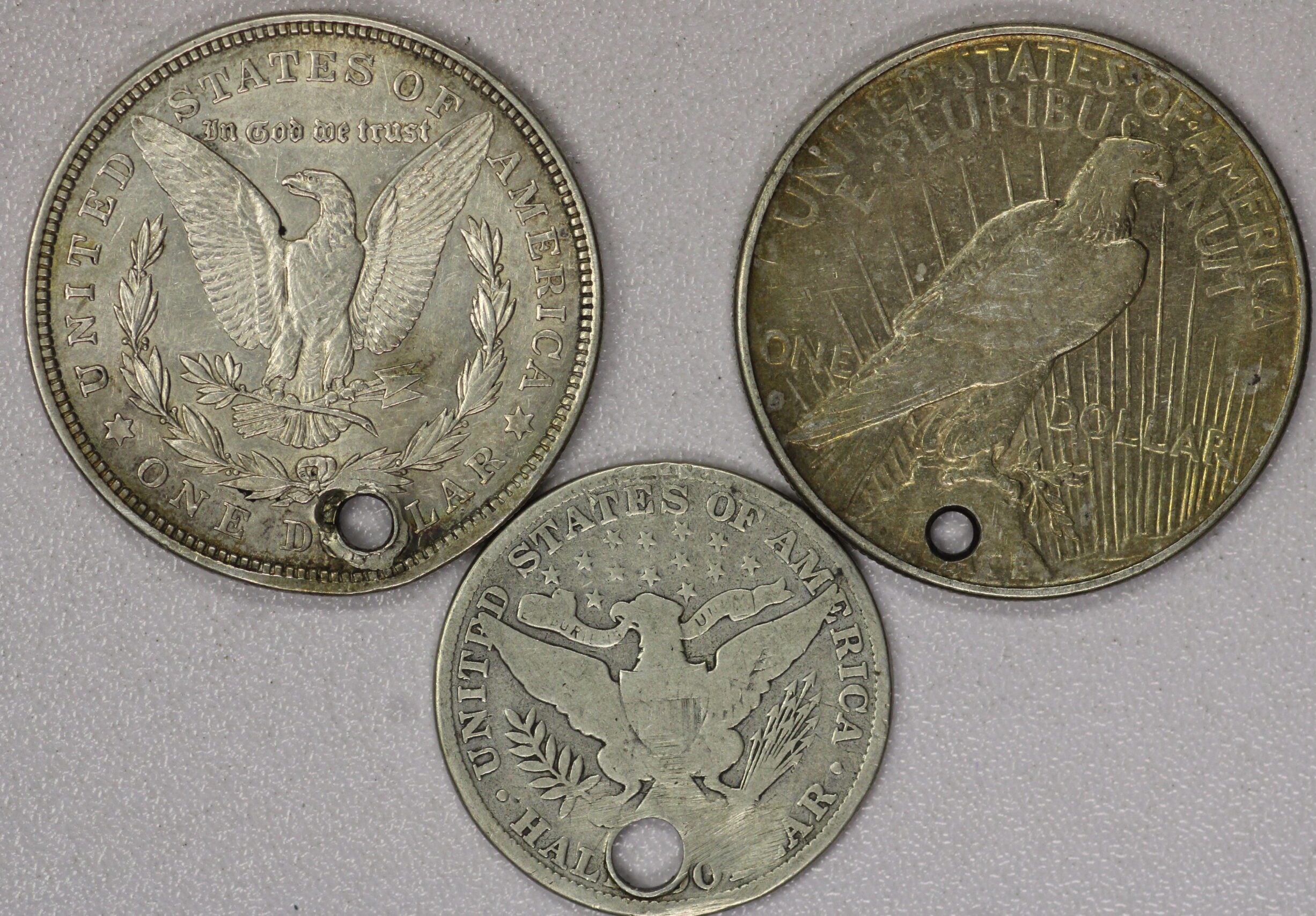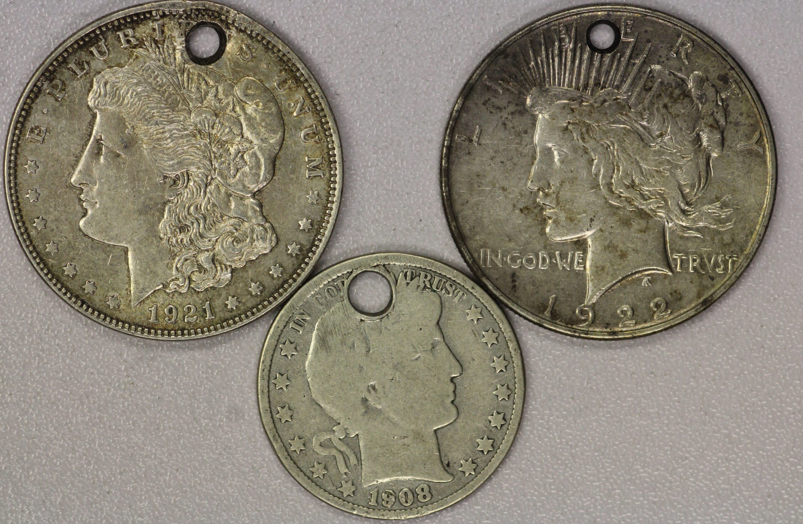 AUCTION-Â Â 1921 & 1922 Holed Silver Dollars & 1908 Holed Barber Half Dollar