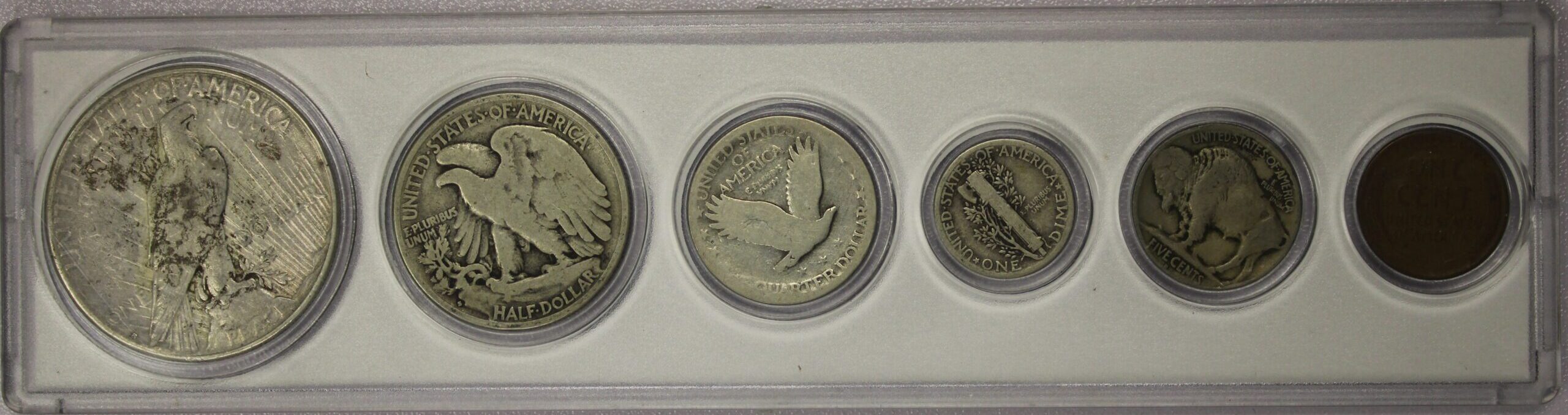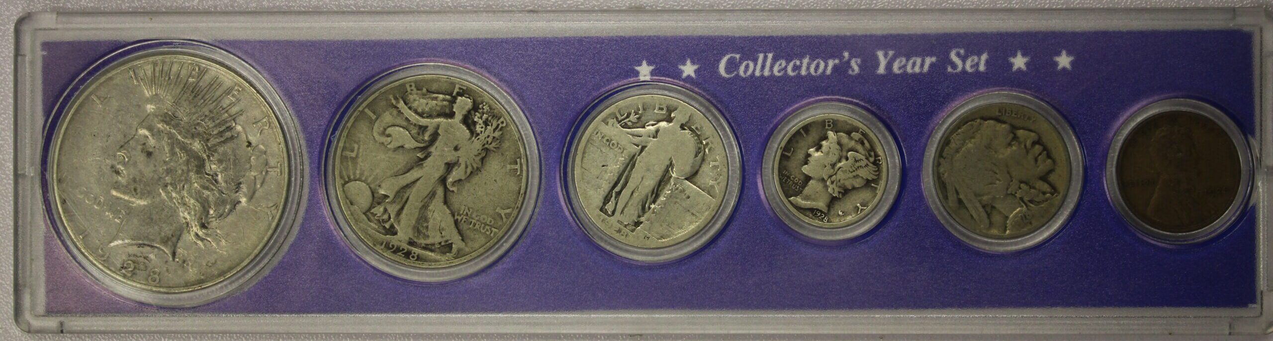 AUCTION-   1928 Year Set Peace Dollar Thru Lincoln Cent.   Peace Dollar is 1928-S, Walker is 1928-S. Standing Quarter is 1928, Mercury Dime is 1928, Buffalo Nickel is 1928-D and the cent is 1928.