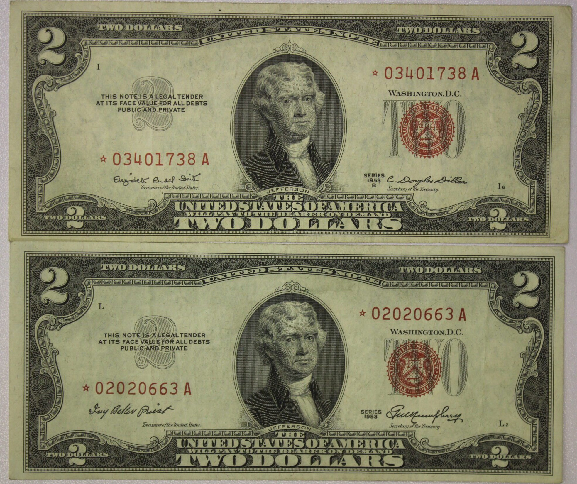 AUCTION- 1953 & 1953-B Two Dollar United States Notes (Red Seal) Circulated STAR NOTES