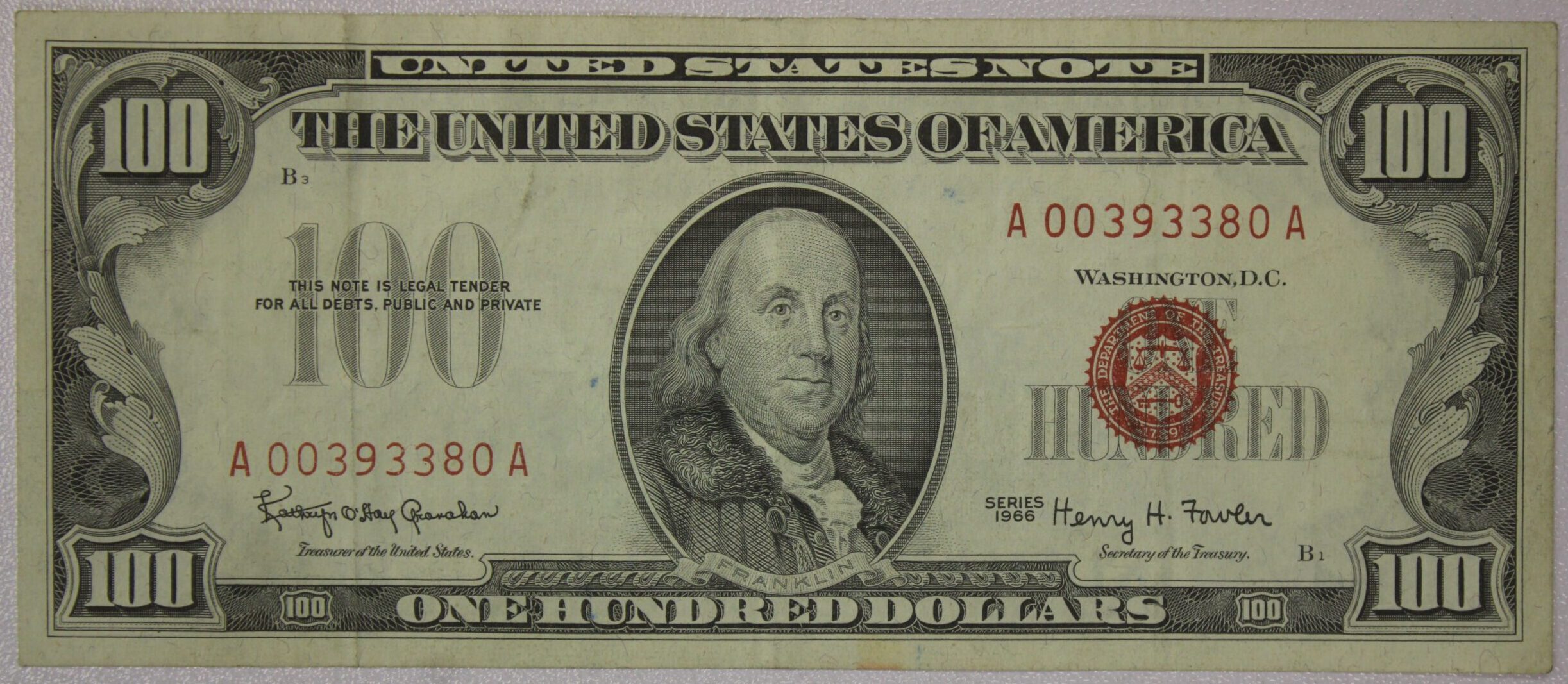 AUCTION- 1966 One Hundred Dollars Red Seal United States Note Very Fine