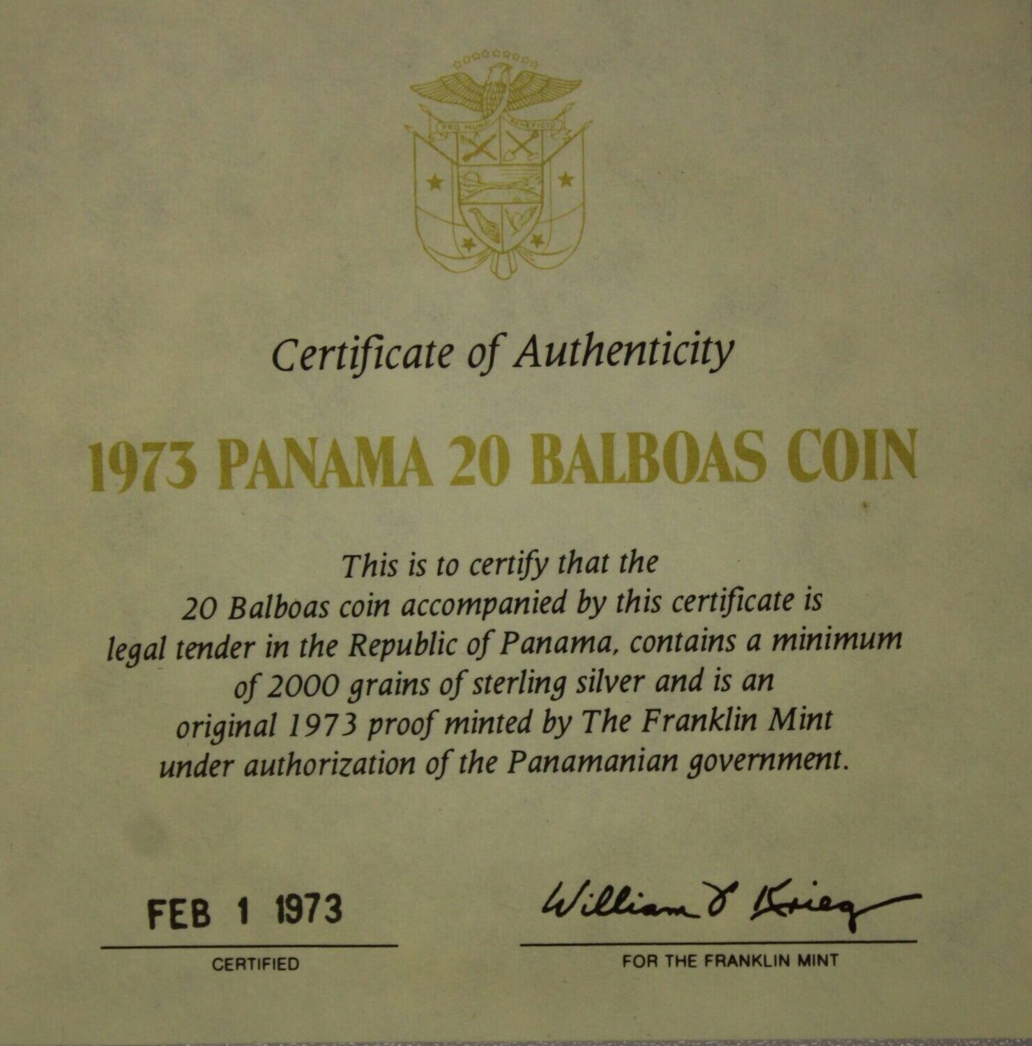 AUCTION-Â Â 1973 Panama 20 Balboas Sterling Silver Coin 4.27 Troy Ounces