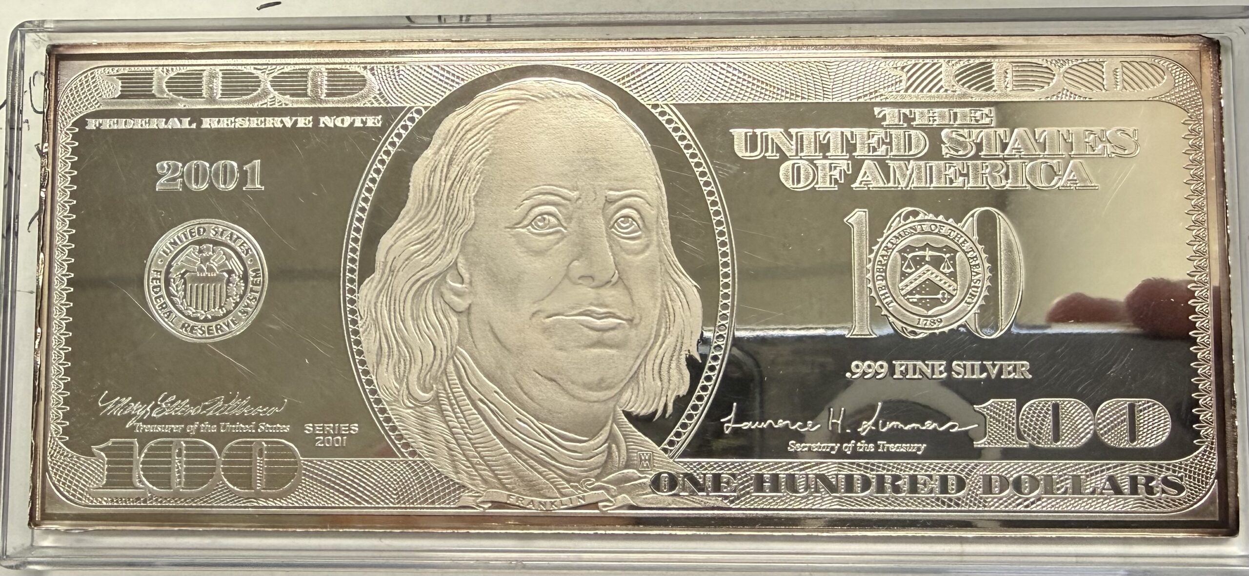 Auction – 2001 $100 Silver Bar 4 Troy ounces .999 Fine Silver
