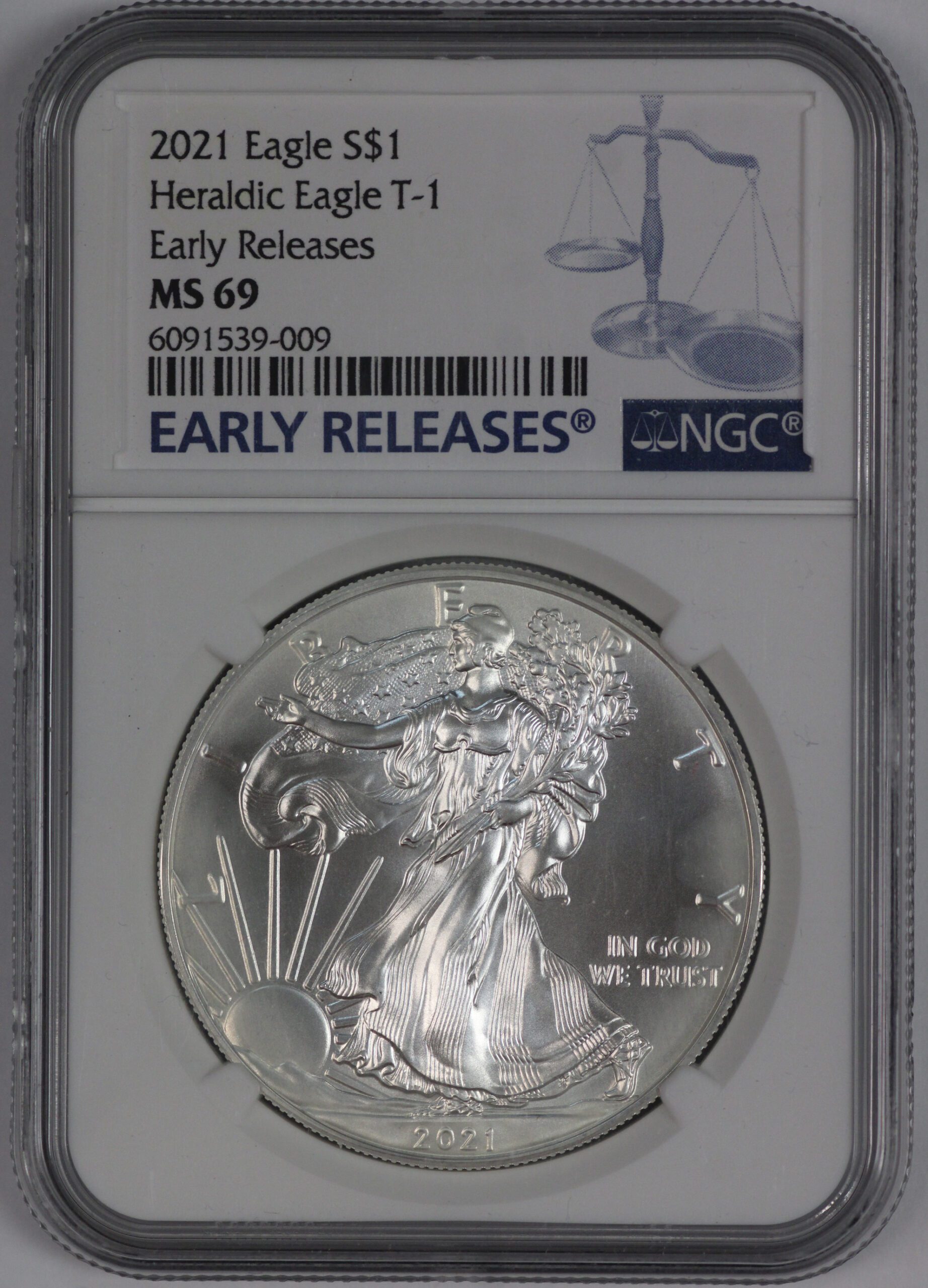 Auction – 2021 American Silver Eagle Type 1 NGC MS69 Early Releases – Toned/Spotting