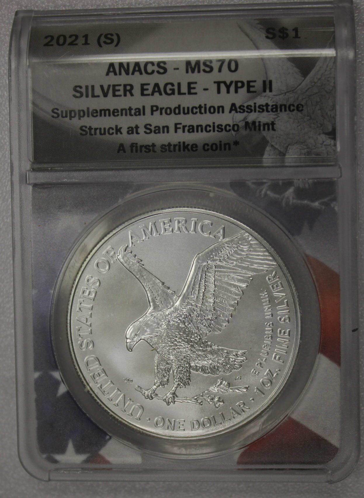 AUCTION- 2021 (S) American Silver Eagle Type Two ANACS MS70