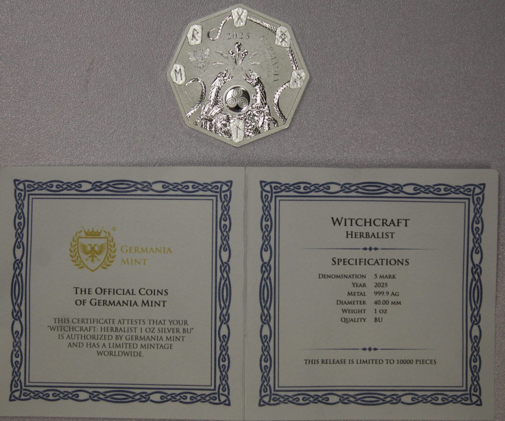 AUCTION-Â Â 2025 Germany 5 Marks One Troy Oz. .9999 Silver Germania Mint Witchcraft Herbalist
