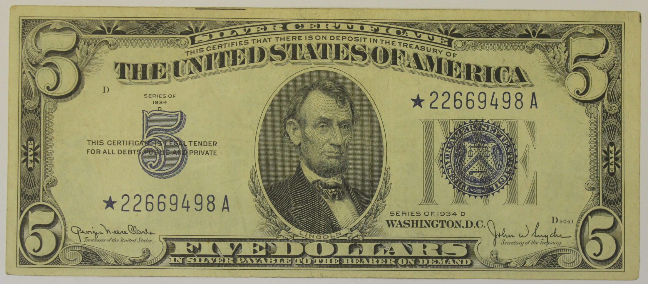 AUCTION- Series 1934-D Five Dollar Silver Certificate STAR NOTE Fine