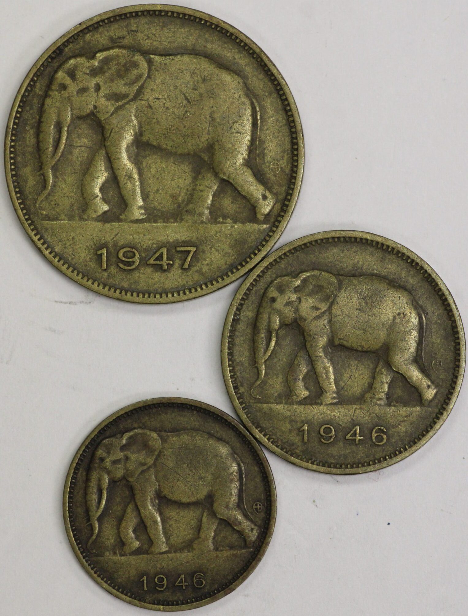 Three Belgium Congo Elephants 1, 2 and 5 Francs 1946 and 1947
