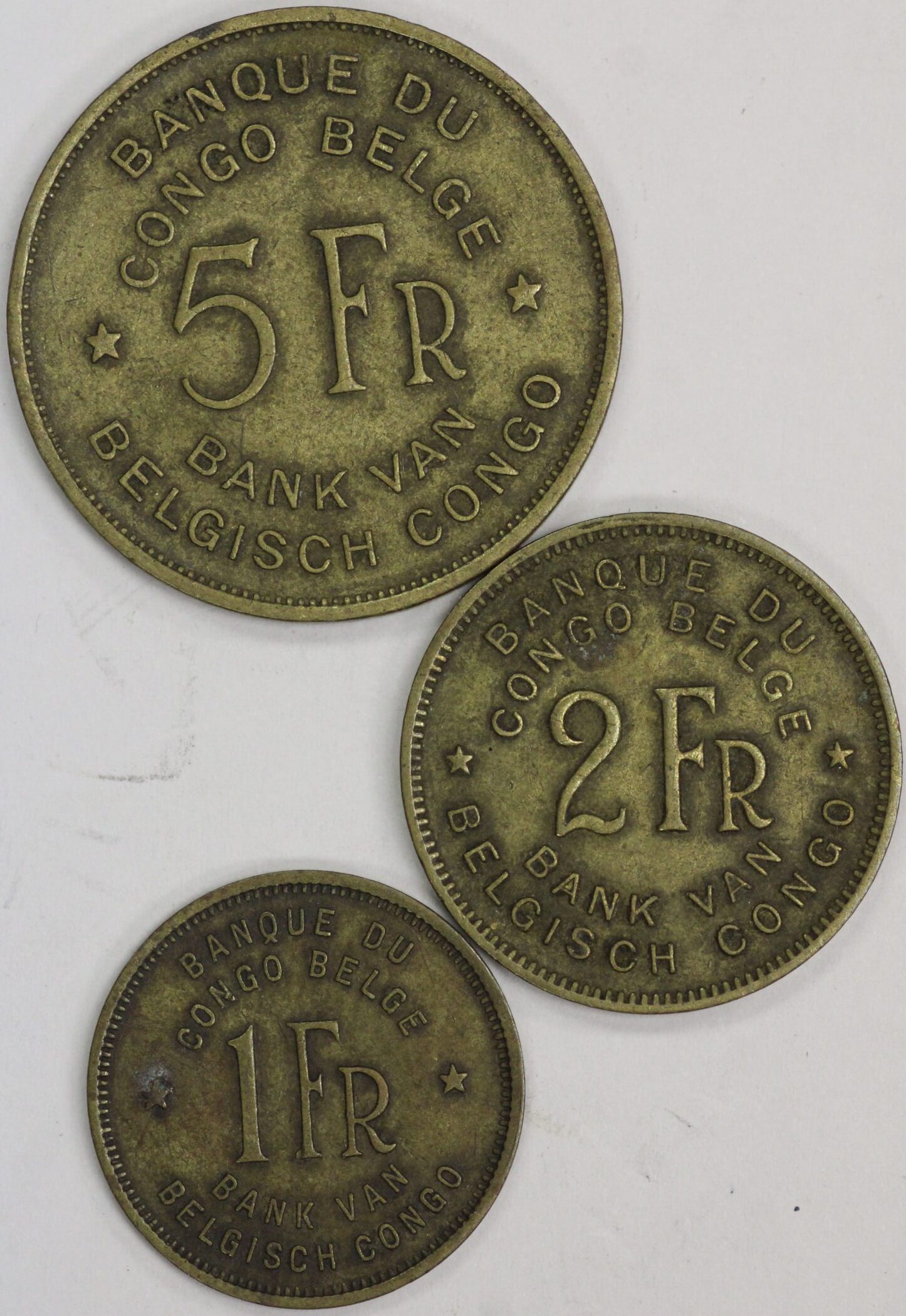 Three Belgium Congo Elephants 1 Franc 1947, 2 francs 1946 and 5 Francs 1947.