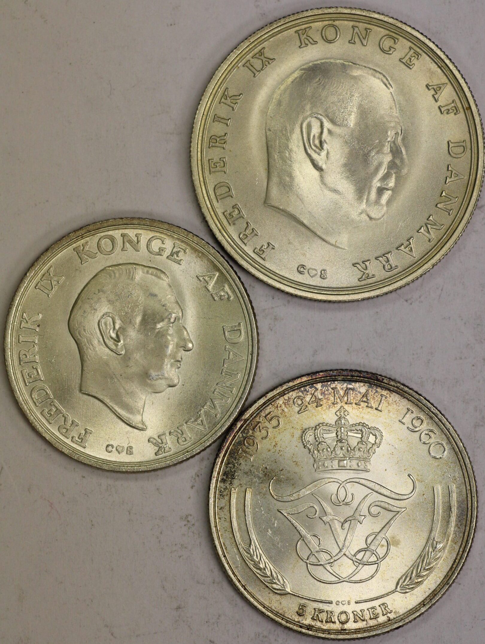 Three Denmark Silver Coins: 2 Kroner 1958, 5 Kroner 1960 & 10 Kroner 1968Â 1.3477 ASW